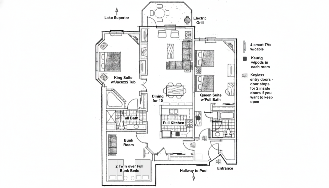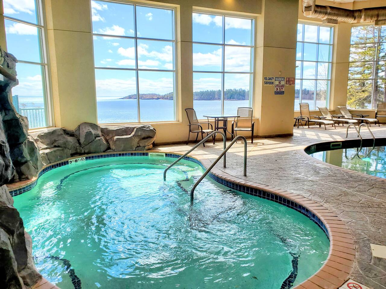 ★ Lakefront Leisure: A Serene Waterside Escape ★ Dive into the tranquil beauty of our waterfront retreat, where every moment becomes a cherished memory. Unmatched scenery right from your doorstep. Ideal for relaxation and soaking in the natural surroundings. Perfect for outdoor meals and gatherings. Step into a world of aquatic adventures. Experience the ultimate in lakeside living with our stunning lake view patio deck, complete with a grill and al-fresco dining table. It's the perfect setting for enjoying sunsets, hosting memorable gatherings, or simply unwinding in the beauty of nature. ★ A Cozy Lake Condo Full of Comfort and Entertainment ★ Step into a world where cozy meets chic, set against the backdrop of tranquil lake views. Inviting fireplace creating a heartwarming ambiance. Comfortable seating areas for relaxation and socializing. TVs have DirectTV for endless entertainment. Fully stocked kitchen, a haven for culinary enthusiasts. Coin laundry available for your laundry needs. Open layout in the living room, kitchen and dining area enhancing the sense of space. Bright windows bathing the space in natural light, framing the lake's beauty. Indulge in the warmth and comfort of our lake condo's interior, where modern amenities blend seamlessly with a homely charm. The spacious living area, aglow with natural light and a fireplace, offers the perfect setting for both lively gatherings and moments of serene solitude. ★ Dreamy Bedrooms and Baths ★ Discover your personal retreats within our lakefront haven, designed for restful nights and refreshing mornings. King Suite w/Bunk Room: Master bedroom with a luxurious king bed, jacuzzi tub, fireplace, closet, cooling fan and lake view. Full bathroom with a shower, a vanity sink and toilet. Bunk bedroom with two twin over full beds, complete with a TV and lounging area for kids. Double Queen Suite: Bedroom featuring two queen beds, TV and a stylish dresser. Full bathroom, boasting a tub and shower combo, a vanity sin, and a comfortable toilet. Microwave and refrigerator cabinet to supplement the main kitchen area Our thoughtfully appointed bedrooms ensure a restful night's sleep, while the spa-like bathrooms offer a rejuvenating start to your day. Whether you're enjoying the spacious master suite or the cozy loft, every moment is designed for your comfort. ★ Shoreline Serenity: Your Lakeside Oasis in Two Harbors ★ Embrace the captivating allure of the North Shore, where the pristine waters of Lake Superior meet rocky beaches and crackling fire pits. Nestled on the waterfront, our retreat offers: Direct access to the rocky beaches of Lake Superior. Fire pits where evenings come alive with stories and s'mores. A serene escape on the renowned North Shore. The perfect spot to watch breathtaking sunrises and sunsets over the lake. Hiking trails along the shoreline for nature enthusiasts. A unique opportunity to experience the tranquility of Two Harbors. Unwind, relax, and connect with nature in this picturesque lakeside setting. Whether you're basking in the sun on the rock beaches or sharing stories by the fire pits, the beauty of Two Harbors awaits just beyond your doorstep. ★ Pool and Hot Tub Retreat ★ Dive into relaxation and soak up the joys of our indoor pool, indoor/outdoor hot tub, sauna and fitness center, where every day feels like a vacation. Indoor pool offering a refreshing oasis any time of the year. Inviting indoor and outdoor hot tub or sauna, perfect for soothing tired muscles. Poolside loungers for sunbathing and leisurely afternoons. Surrounded by stunning lake views and lush landscapes. Indulge in the ultimate leisure experience as you bask in the sun by the pool or soak in the soothing hot tub. With panoramic lake views as your backdrop, every moment spent here is a memory in the making. ★ Entertainment and Relaxation at Your Fingertips ★ Discover a world of entertainment and relaxation options within our lakeside retreat. TVs: Enjoy your favorite shows and movies on our three TVs with DirectTV. Board Games: Gather around for fun-filled game nights with a selection of board games. Cozy Fireplaces: Stay warm and cozy by the fireplace on chilly evenings in both suites. Bright Windows: bright windows for abundant natural light and views of Lake Superior. Fully Stocked Kitchen: A kitchen equipped with everything you need for culinary adventures, including a Keurig coffee machine with pods or a drip coffee maker if you prefer that. From movie nights to game nights, our retreat is designed to ensure you have all the entertainment and relaxation you desire. Whether you're unwinding by the cozy fireplace or enjoying a family movie night on our Smart TVs, every moment here is filled with comfort and enjoyment. ★ Your Health and Safety is Our Top Priority ★ We take your health and safety seriously. Our Lake Superior North Shore Condo is professionally cleaned and disinfected before every stay, and we follow all CDC and WHO guidelines to ensure a safe and comfortable stay. We use hospital-grade cleaning products and pay special attention to high-touch areas such as door handles, light switches, and countertops. Our linens and towels are washed and dried on high heat settings to kill any bacteria or viruses. You can rest easy knowing that our home is a clean and safe environment for you and your loved ones. Let us take care of the cleaning so you can focus on enjoying your stay.